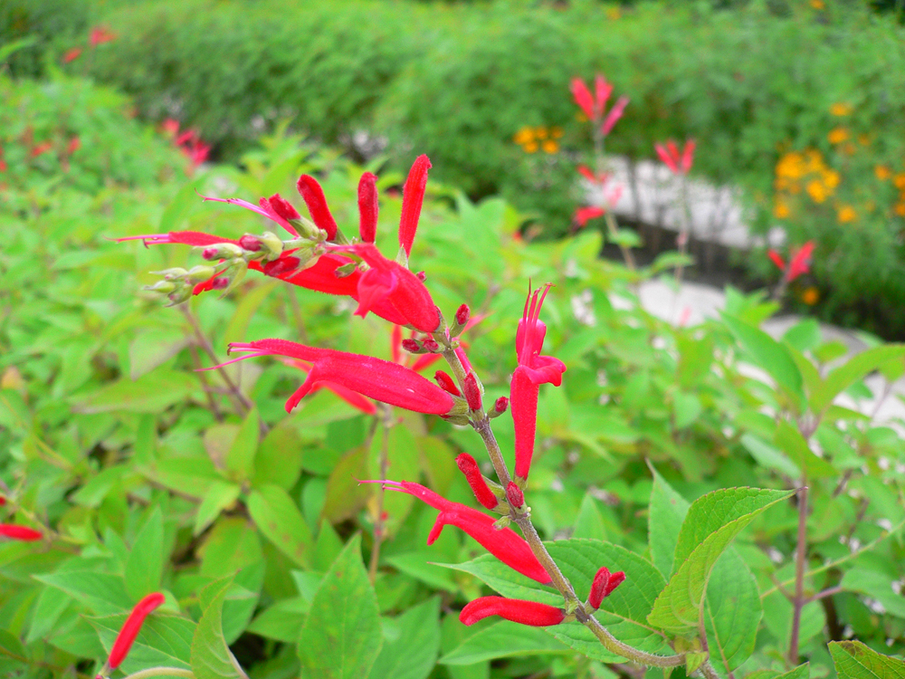 鳳梨鼠尾草生長快速、強健,葉片為綠色,花為紅色筒狀花,盛開時極為喜氣喔!